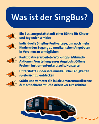 Der SingBus ist ausgestattet mit einer ausklappbaren Bühne und der Sing- und Klingausstellung. Er macht Halt auf Marktplätzen, Schulhöfen oder vor Vereinsheimen. Workshops, offene Proben, Instrumentenkarussells und andere Attraktionen sind möglich. Auf der SingBus-Bühne ist Platz für alle Kinder, die ihre Leidenschaft für das gemeinsame Musizieren mit anderen Kindern teilen möchten. Jedes SingBus-Festival ist dabei einzigartig: Gemeinsam mit den Aktiven aus den Vereinen vor Ort wird das Programm partizipativ gestaltet, sodass die Festivals passgenau auf deren Wünsche zugeschnitten sind.