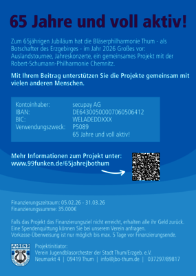 Die Projekte des Jahres 2026 stärken die musikalische Ausbildung junger Menschen im Erzgebirge. Doch sie kosten eine erheblich Summe. Diese zusammenzubekommen, soll mit einer Crowdfunding-Kampagne gelingen. Das Geld daraus fließt direkt in die Nachwuchsarbeit sowie Reisekosten, Notenmaterial, Raummieten, Kleidung und Reparaturen von Instrumenten.