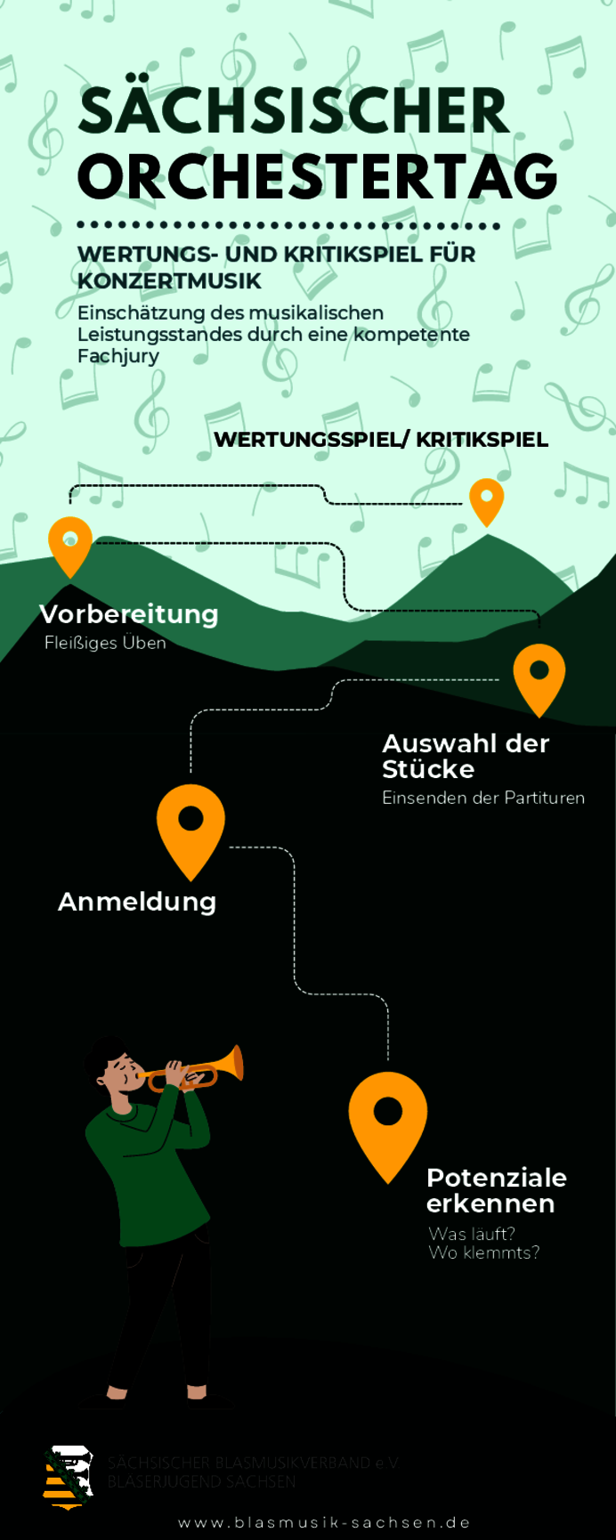 Das Wertungsspiel zum Sächsischen Orchestertag gibt den teilnehmenden Ensembles die Möglichkeit, ihren musikalischen Leistungsstand von einer kompetenten Fachjury einschätzen zu lassen und soll gleichzeitig als „Generalprobe“ für die am Deutschen Musikfest teilnehmenden Vereine dienen.